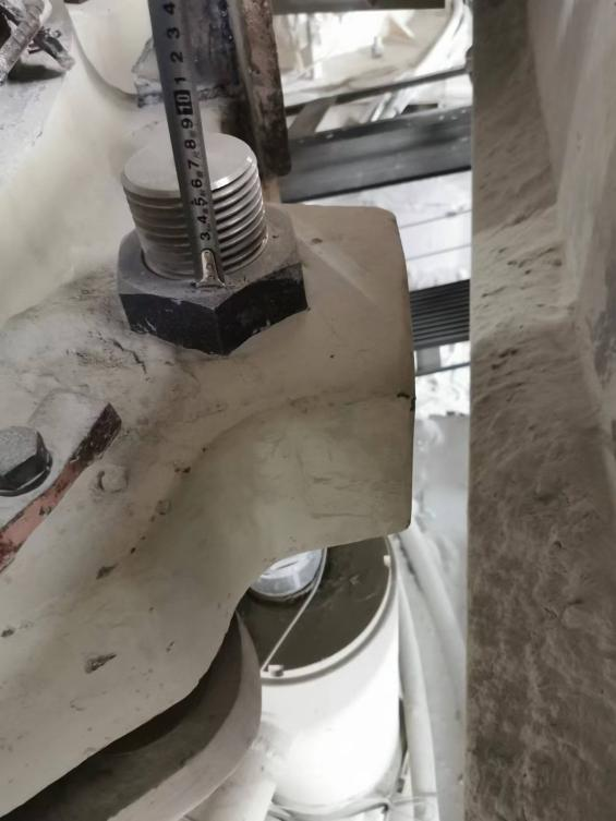 5、將每個(gè)釋放缸活塞桿頂部到上螺母頂部距離調(diào)整到25mm(約4個(gè)螺紋,每臺(tái)設(shè)備上的6個(gè)釋放缸距離必須調(diào)整一樣,因?yàn)檎{(diào)整環(huán)和下架體通過液壓鎖緊,6個(gè)活塞桿高度不一致會(huì)導(dǎo)致受力不均,過鐵時(shí)易損壞釋放缸)。
